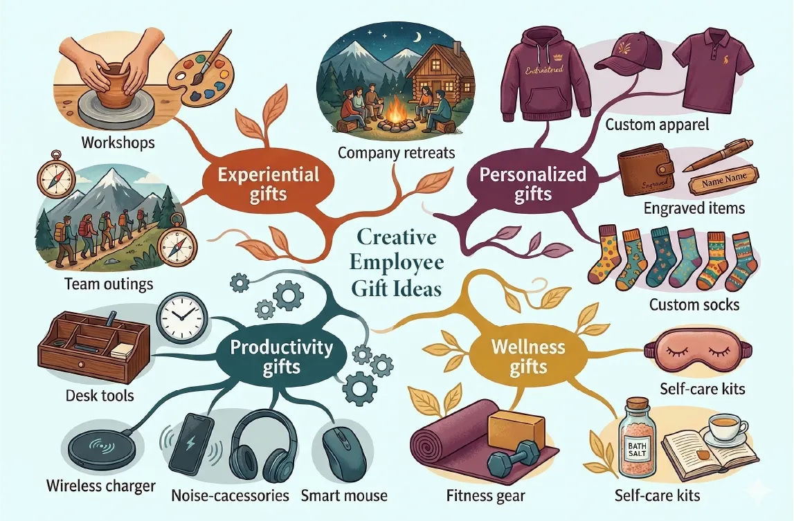 Unique employee gifts help companies show appreciation while strengthening company culture and team morale. Popular options include personalized office accessories, wellness kits, experiential gifts, and branded merchandise such as custom apparel. The most effective employee gifts combine practicality, personalization, and long-term usefulness, making employees feel valued and recognized.