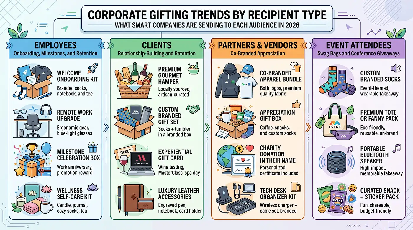 Different relationships call for different gifts. A client renewal gift is not the same as a new hire kit. Here is a quick map.