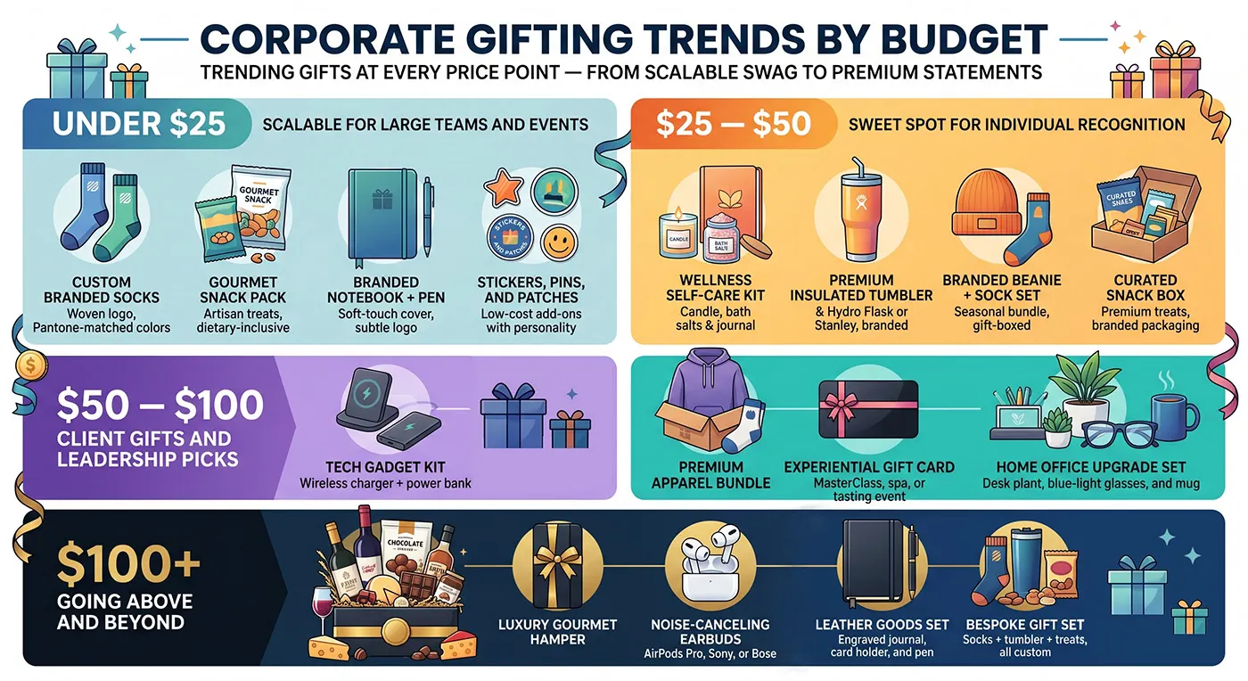 Under $25. Custom socks, branded notebooks, gourmet snack packs, desk plants. Best for bulk onboarding and event swag.