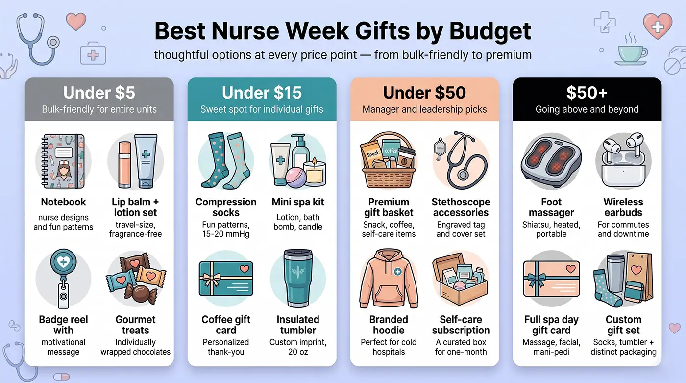 Not sure what to get your nursing team this year? This guide covers nurse week gift ideas across six categories and four budget tiers. You will learn what real nurses want, which gifts to avoid, and how to plan a celebration that includes every shift.