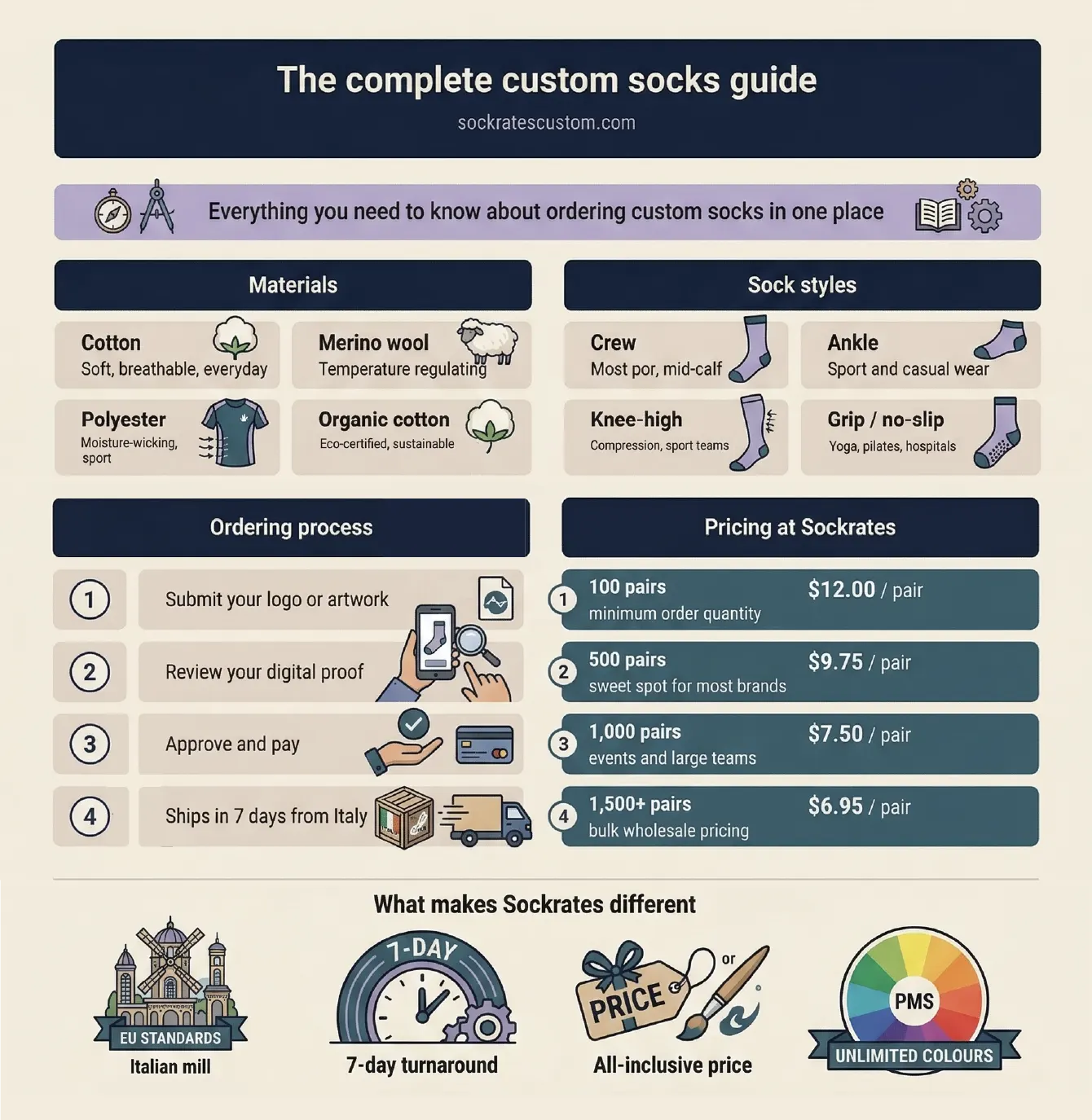 Everything you need to know about custom socks is in this guide. It walks through the different sock types (athletic, dress, wool, organic, baby, compression, retro tube, and grip), explains key design elements like logos, color choices, and Pantone matching, and helps you understand materials and manufacturing. You'll also find practical info on pricing and use cases. It's built for anyone thinking about custom socks, whether that's for corporate gifting, team uniforms, brand promotions, or personal events like weddings and baby showers.